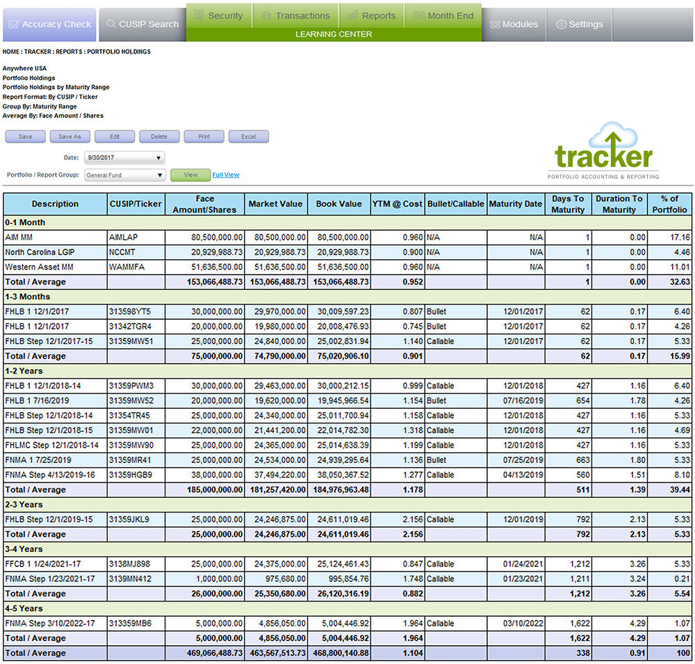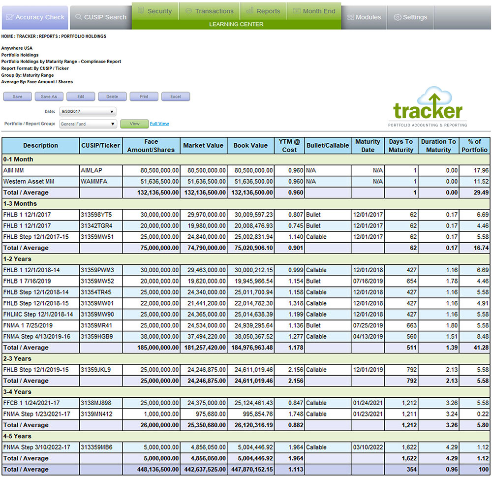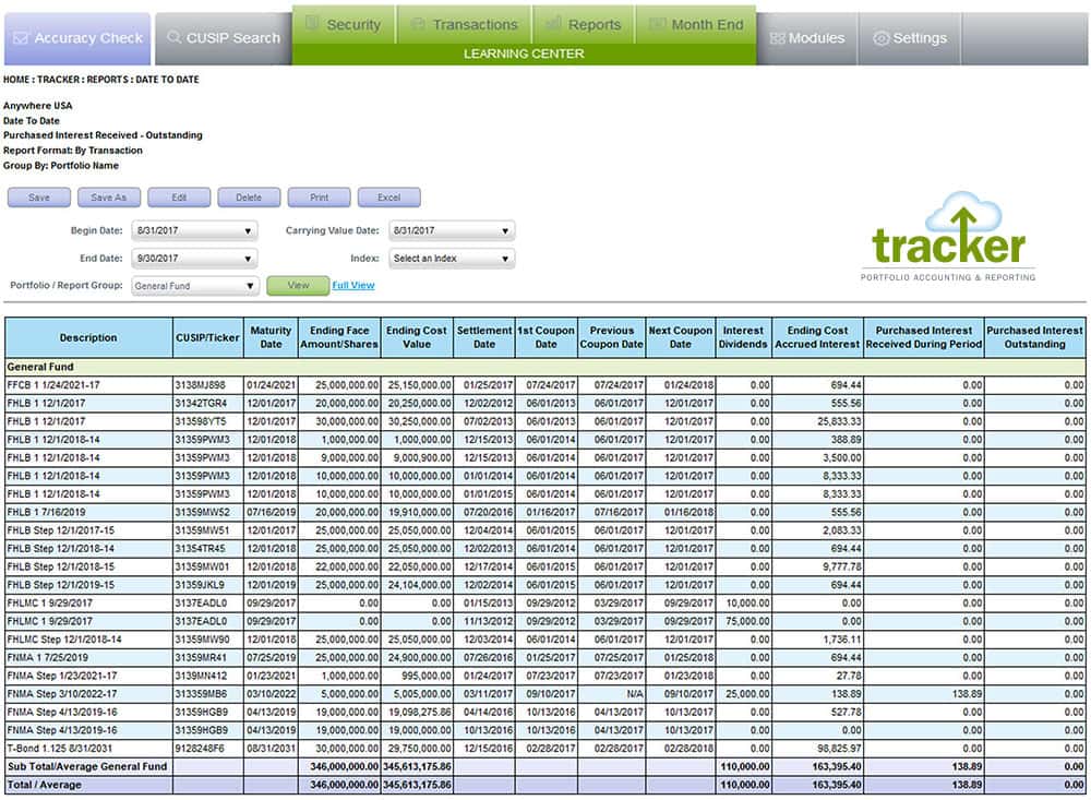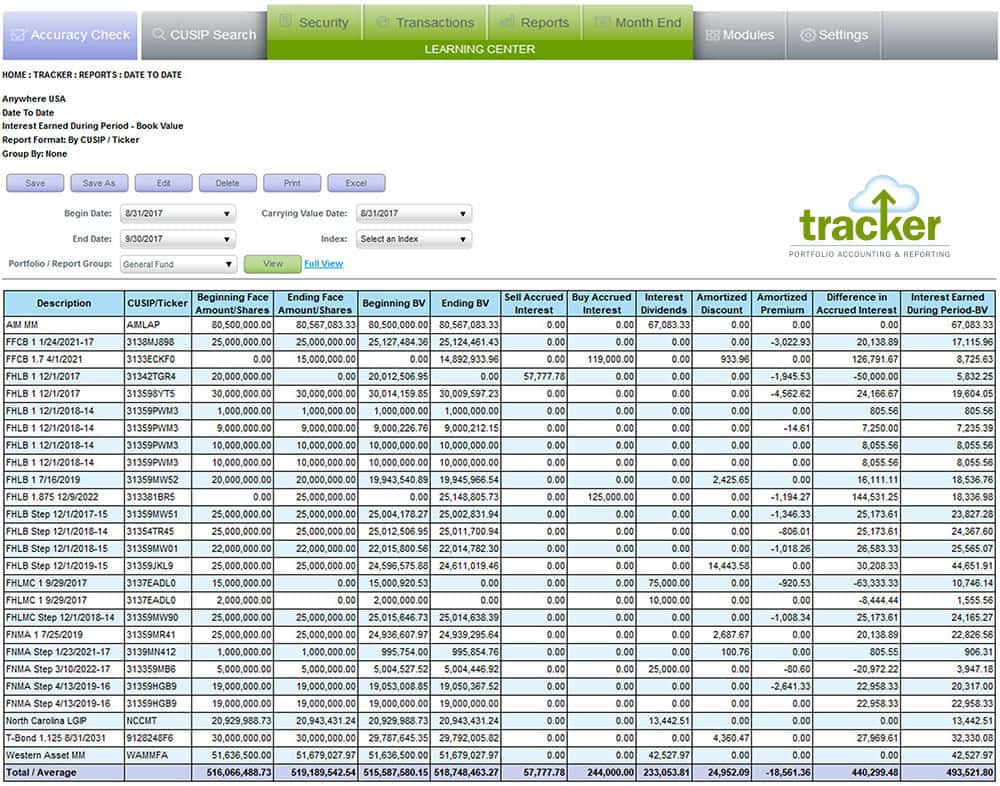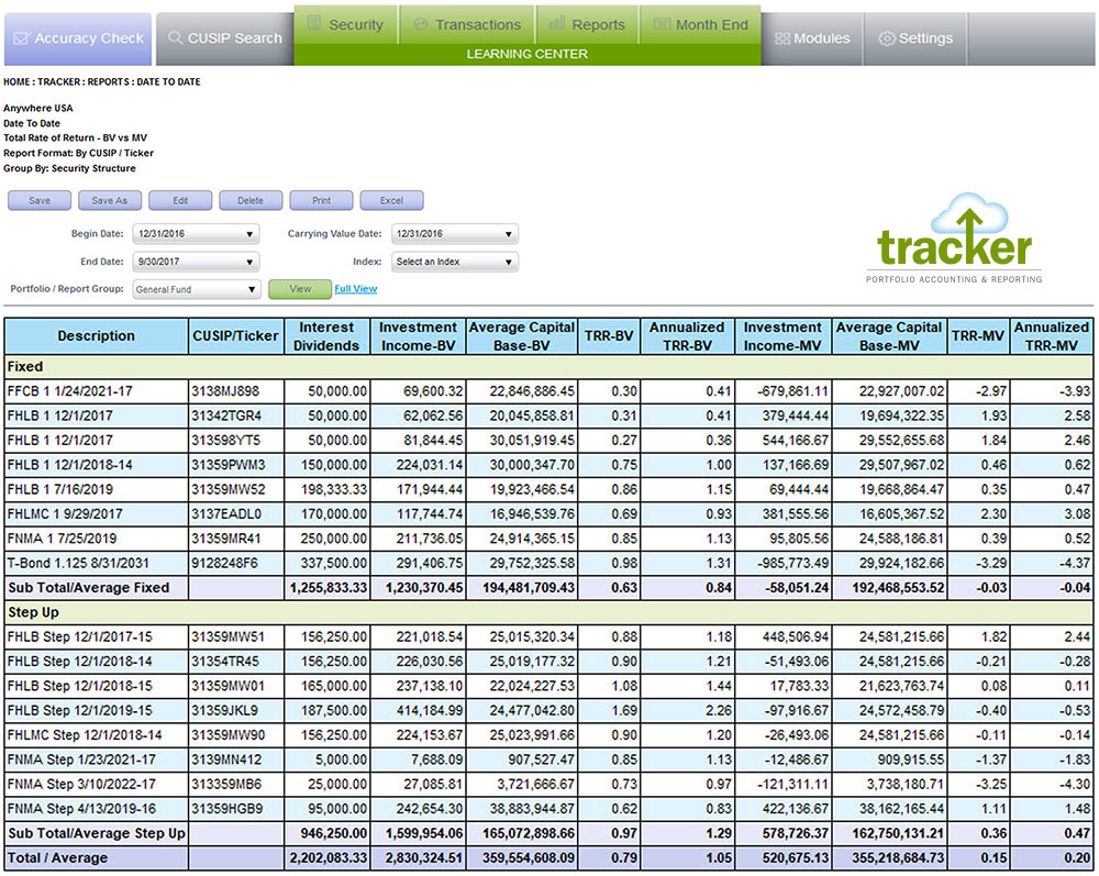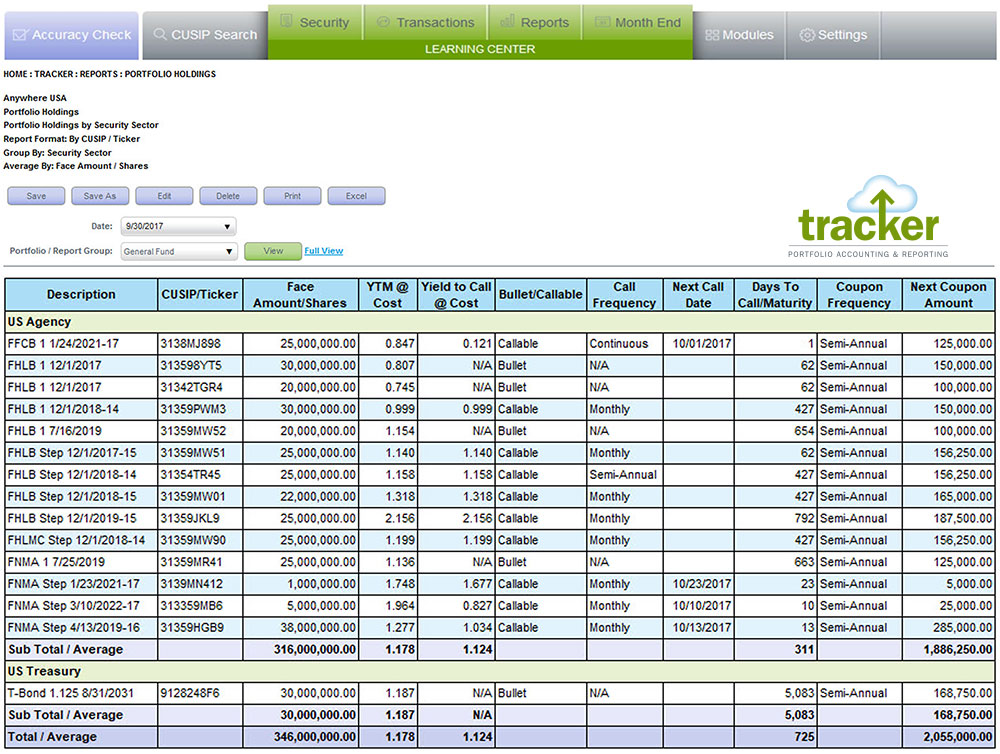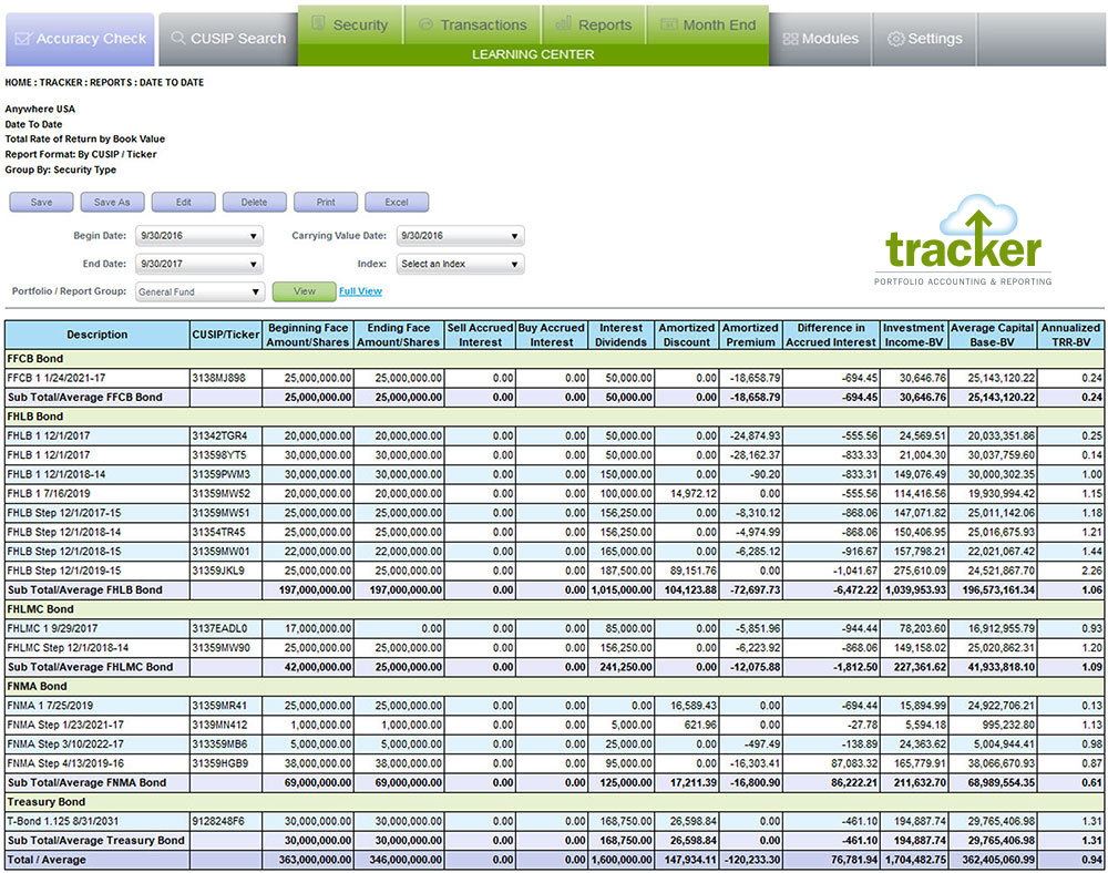 With the ability to calculate earnings, days to maturity, accrued interest, yield to maturity at cost, capital gains/losses, book value, market value, amortization, duration, average yield, total return and much more!