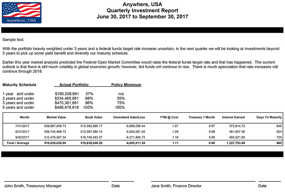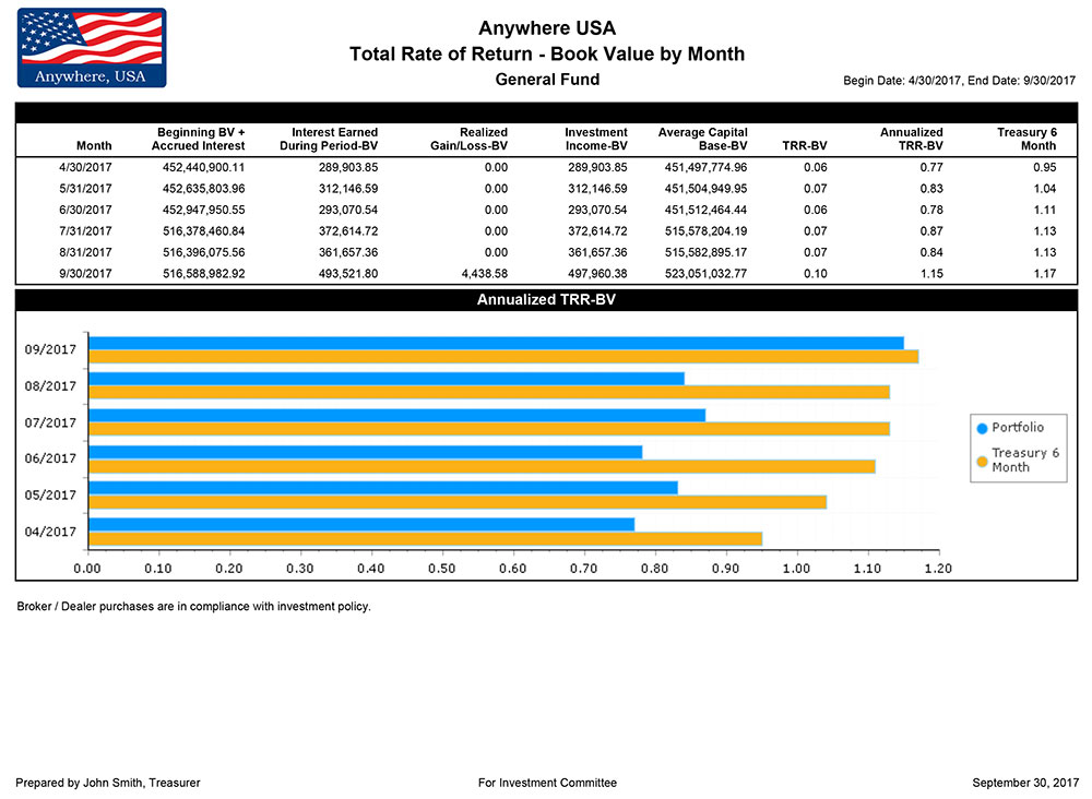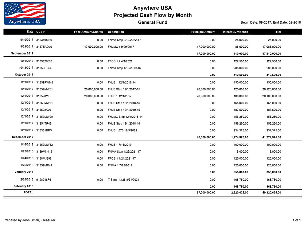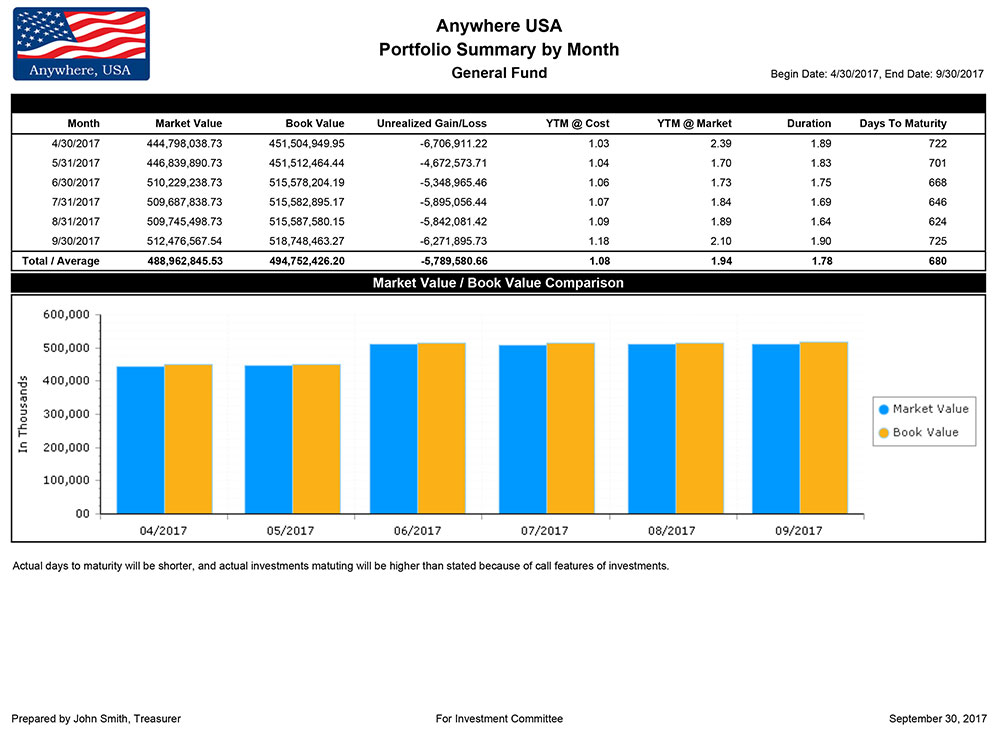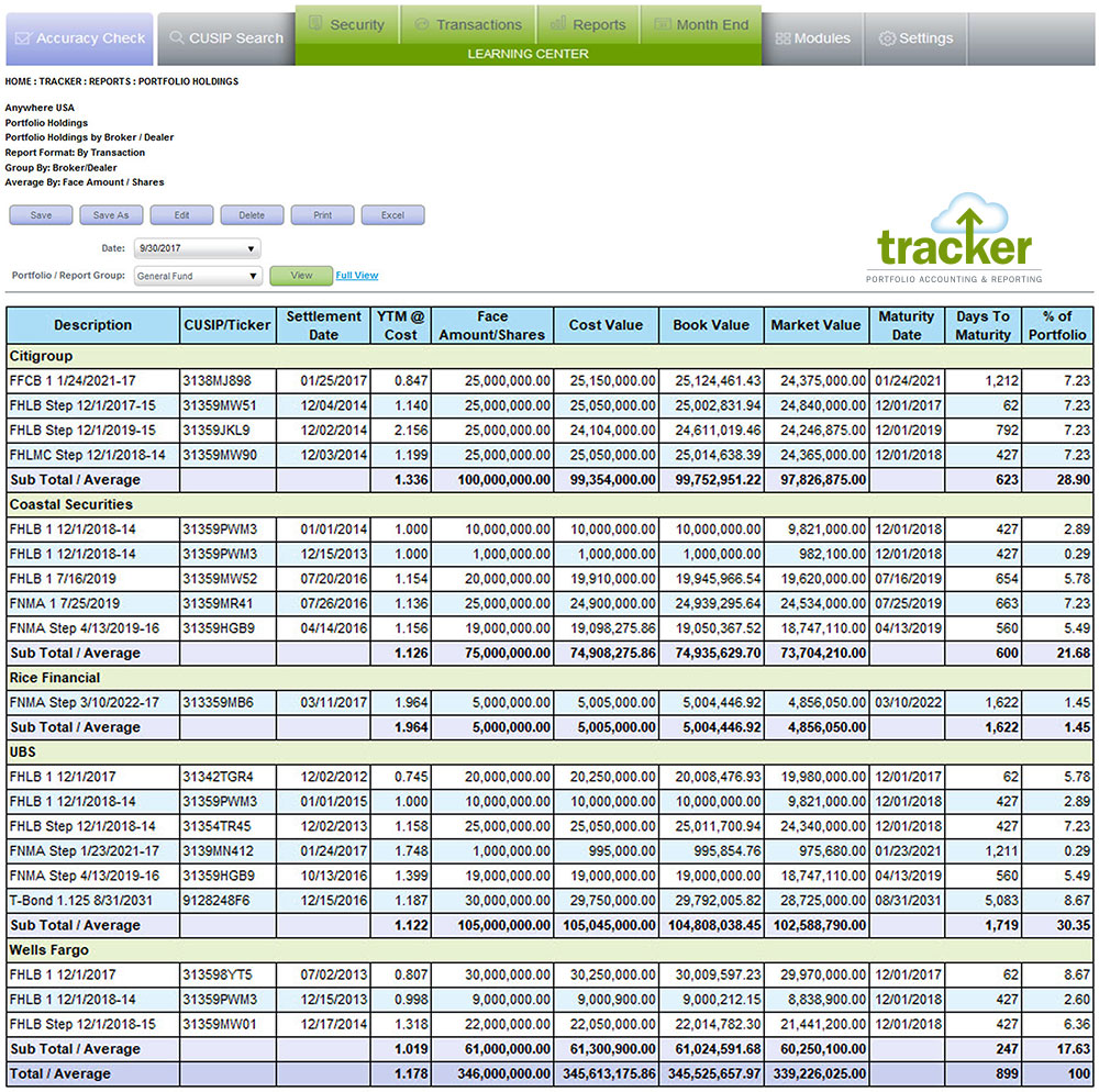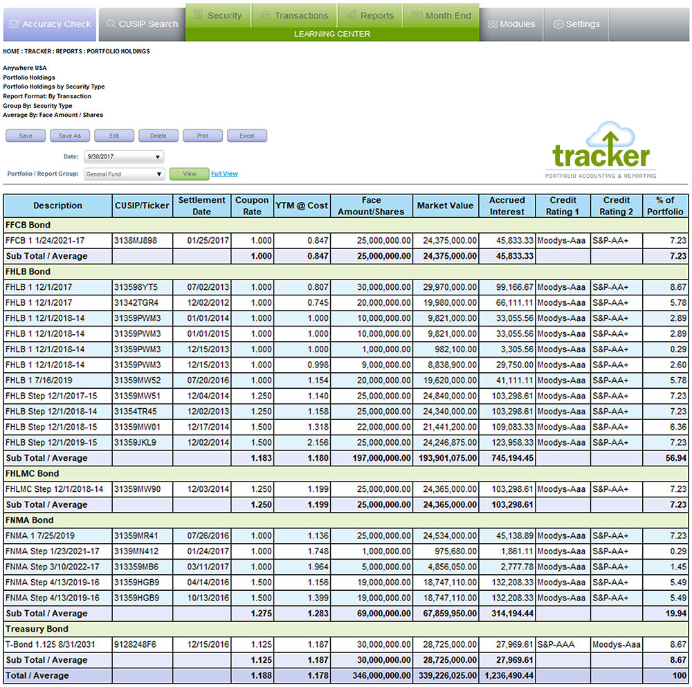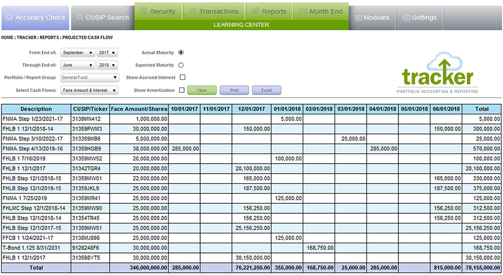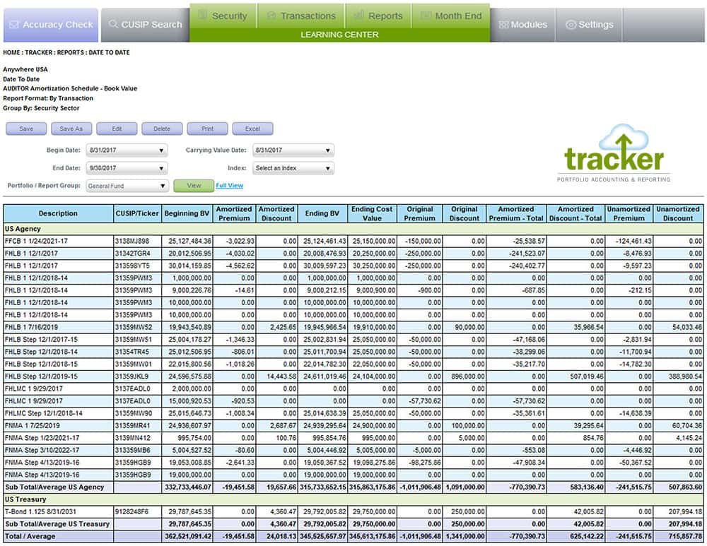 With the ability to calculate earnings, days to maturity, accrued interest, yield to maturity at cost, capital gains/losses, book value, market value, amortization, duration, average yield, total return and much more!